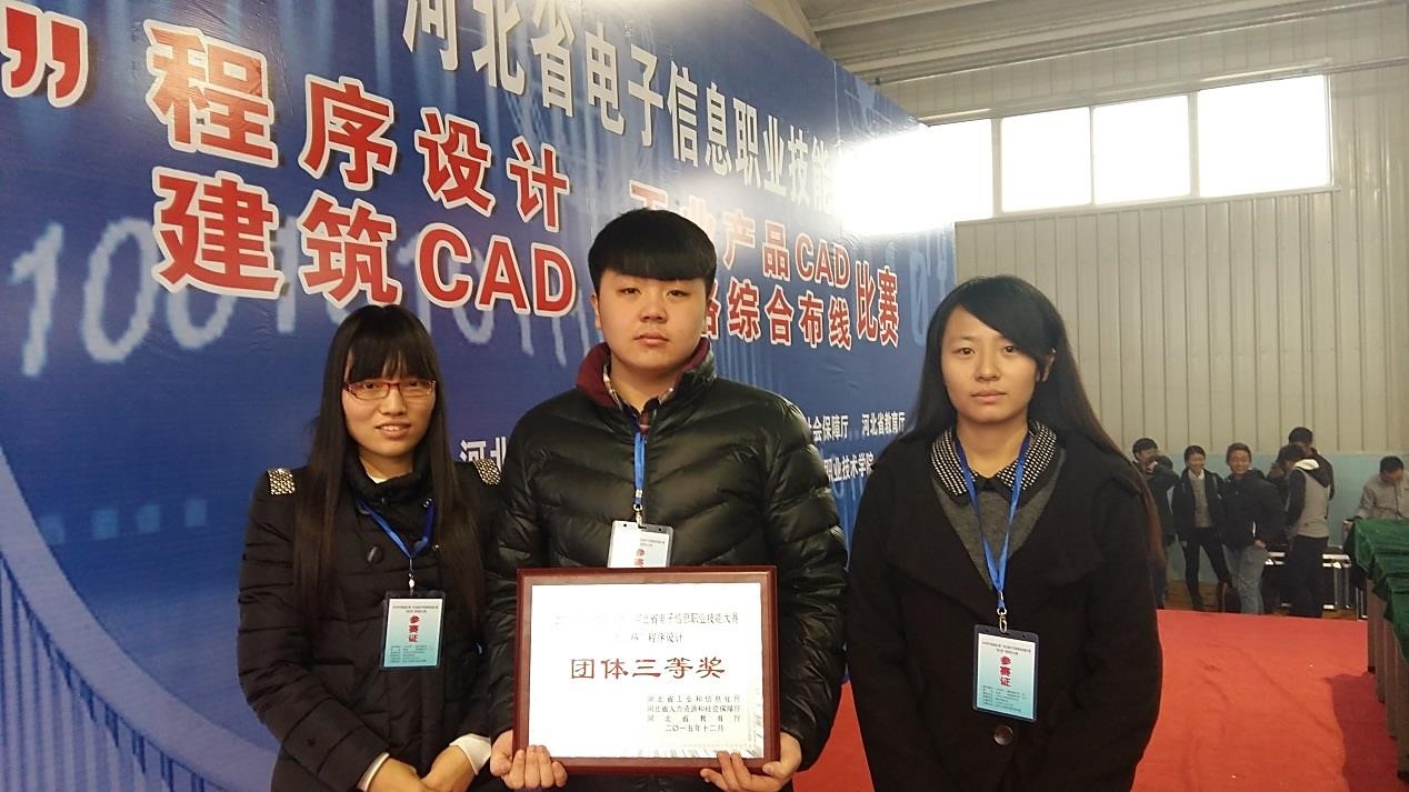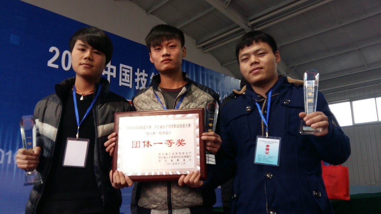 12月11日,2015年中国技能大赛——河北省电子信息职业技能大赛中,公司信息技术系派出的2014级物联网工程专业的两个代表队在程序设计比赛中分别获得团体一等奖和二等奖,其中孙明杰、张存波还获得个人一等奖,王星获得个人二等奖。本次大赛由河北省工业和信息化厅、河北省人力资源和社会保障厅、河北省教育厅联合主办,河北工业职业技术公司承办,共有来自全省各高校及高职院校的1000多名选手参加。