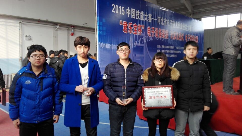 12月26日,2015年中国技能大赛——河北省电子信息职业技能大赛第三阶段(计算机调试)竞赛中,我系派出的2014级物联网工程专业代表队(王海生、陈银龙、孙宇、苏烨鑫、郑红娇)获得团体三等奖,其中王海生、陈银龙获得个人三等奖。