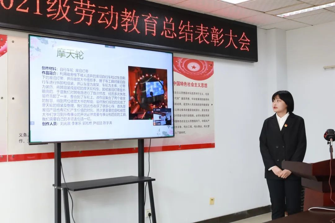 会上同学们展示了“变废为宝”的设计作品,张浩轩作为员工代表发言,表示通过此次劳动教育,更加理解劳动的本质,要进一步夯实基础,服务社会。