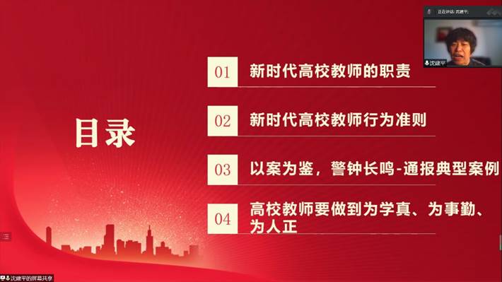 沈书记从“新时代高校教师的职责、新时代高校教师行为准则、典型案例、高校教师要做到为学真、为事勤、为人正”四个方面,结合高校教师违反“新时代高校教师职业行为十项准则”的典型案例,对高校教师职责和行为准则进行了详细的解读。要求全体教师进一步提高认识,明确师德师风建设的重要意义,以立德树人为根本,积极弘扬高尚师德,进一步增强为党育人、为国育才的责任感和使命感,真正把为学、为事、为人统一起来,努力成为有理想信念、有道德情操、有扎实学识、有仁爱之心的好老师。