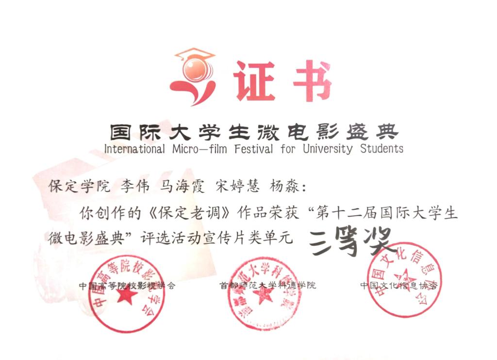 5月18日,第十二届国际老员工微电影盛典在北京举行,公司网络与新媒体专业员工李伟、马海霞、宋婷慧、杨淼等拍摄作品《保定老调》荣获活动宣传片类三等奖,教师马笑楠获最佳指导教师奖。这部以展现保定传统戏剧文化的作品从7112部参赛作品中脱颖而出,得到了组委会的一致肯定。