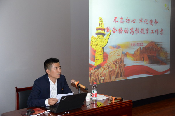 按照公司党总支“不忘初心牢记使命”主题教育活动部署,10月23日下午,公司党总支副书记郝江波同志在E-1-110为全院师生党员和入党积极分子代表110余人讲题为“不忘初心牢记使命 做合格的高校教育工作者”专题党课。从坚持党的领导是高校教育工作的根本遵循,“立德树人”的初心使命是高校教育工作者最重要的政治品格,加强基层支部建设是推进发展的重要动力三方面阐述新时代高校教育工作者的初心和使命。号召师生党员扎实推进“不忘初心牢记使命”主题教育活动,“守初心担使命找差距抓落实”,切实通过主题教育活动,起到提升自我政治理论修养,推动事业更快更好发展的目的。