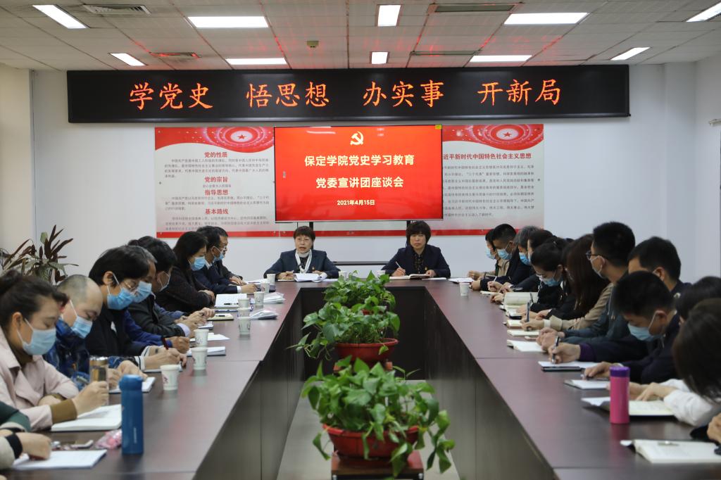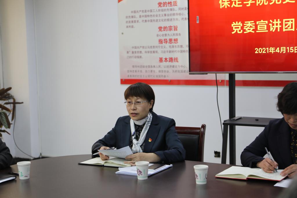 4月15日下午,党委宣讲团副团长、党委副书记、董事长韩会玲在beat365中国官网会议室开展党史学习教育座谈宣讲,审计室、继续教育部工作人员与beat365中国官网教师参加座谈宣讲会。