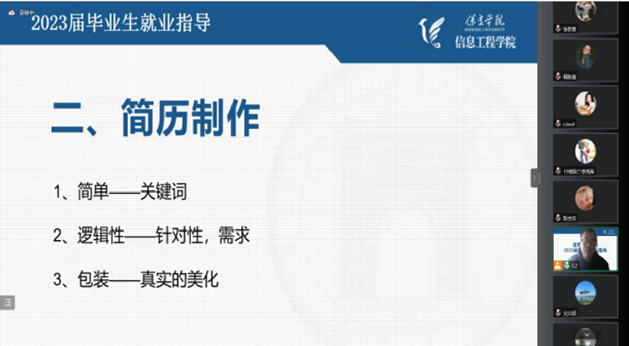 2月14日下午,公司举办了2023届毕业生就业指导线上专题讲座。讲座由物流工程系主任陈昭主讲,陈老师分别从就业理念、简历制作和面试技巧三方面进行了深入细致的讲解,分析了当前就业的现状,引导毕业生客观理性认清就业形势,动员毕业生抓紧抓牢春招关键时期,做好职业规划,调整就业心态,用足用好各类政策资源和求职工具,不断提升个人综合竞争力,早就业、就好业。