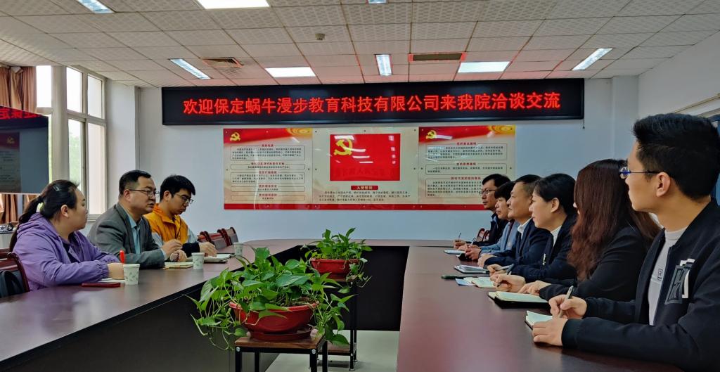 为深入推进2023届毕业生就业工作,深入贯彻教育部、省教育厅关于“访企拓岗”促就业专项行动的决策部署,拓宽员工就业渠道,进一步搭建校企协同育人平台。4月21日上午,保定蜗牛漫步教育科技有限公司来公司洽谈交流,公司党总支书记沈建平、经理刘凤田、副书记范娟、副经理李伟、教育技术专业教研室主任王新及毕业班辅导员张彬参加座谈。