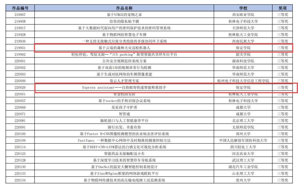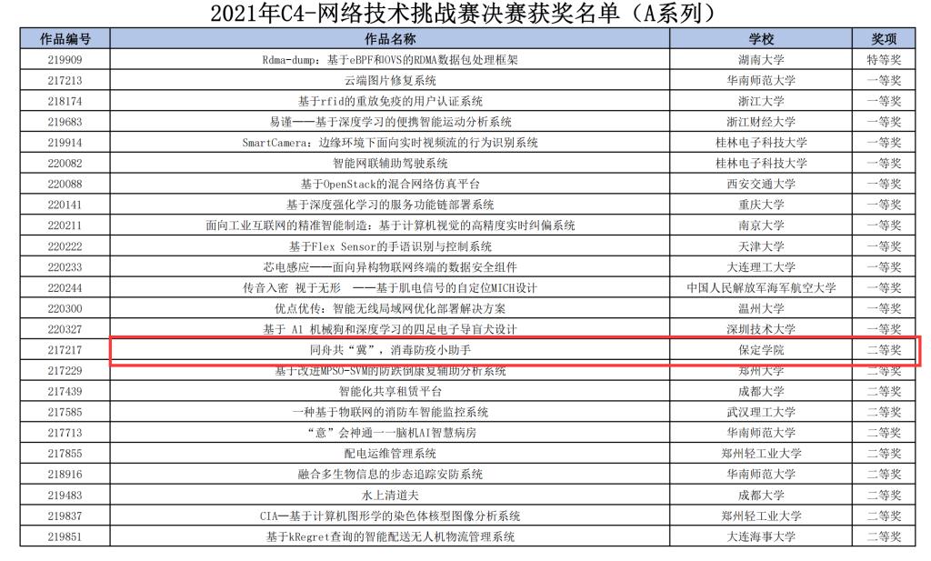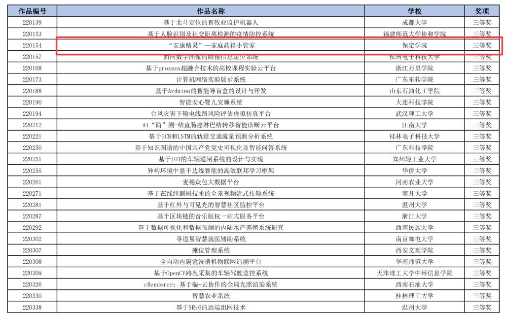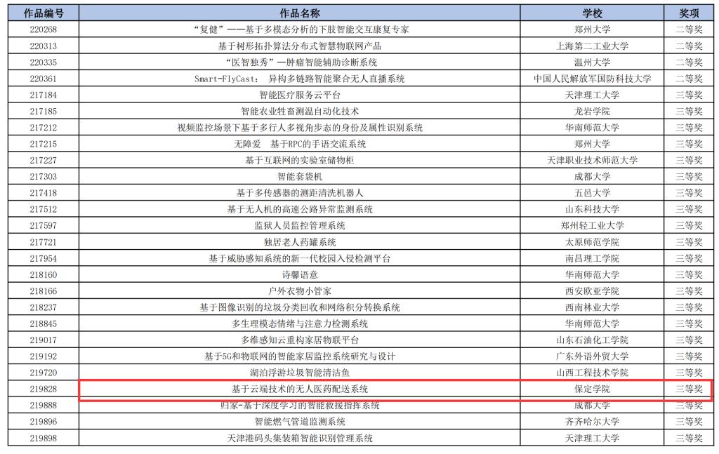 近日,2021年中国高校计算机大赛-—网络技术挑战赛决赛在温州大学落下帷幕。公司物联网工程专业师生再创佳绩,五项作品在总决赛中荣获国家级奖项。其中《同舟共“冀”,消毒防疫小助手》(李超、罗家辉、姚文博等,指导教师:杨青青、秦芹)荣获二等奖,《基于云端技术的无人医药配送系统》(王丽华、姚东、 贾子璇等,指导教师:秦芹、杨青青)、《基于云端的森林火灾巡检机器人》(杜亚雄 刘强生、马赵等,指导教师:刘仲鹏、于平)、《Express assistant——自助邮寄快递智能称重助手》(刘安旭、吴千千、王双凤等,指导教师:刘仲鹏、苑立娟)、《“安康精灵”—家庭药箱小管家》(刘楚轩 安珍宏、李鸿燕等,指导教师:杨青青、刘仲鹏)四个项目荣获三等奖。